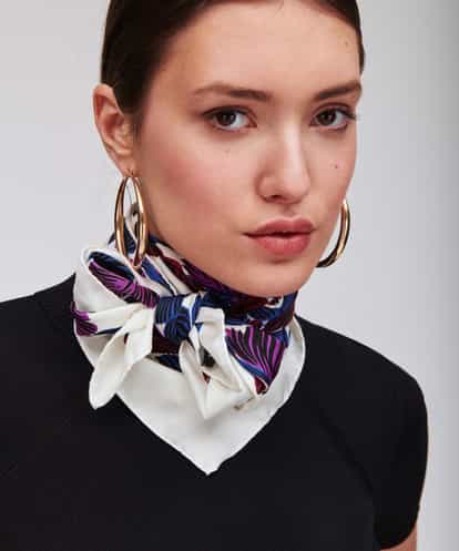 上品な光沢が美しい、シルク仕立てのスカーフです。高級感溢れる質感に、鮮やかに描かれたボタニカルモチーフの柄がスタイリングを華やかに演出してくれるアイテムです。首元に巻いたりバッグのアクセントにしたり、コーディネイトのワンポイントに最適なひと品です。