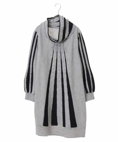 凹凸感のあるモチーフと、引き返し編みを駆使したチュニック丈のニットプルオーバー。袖口にかけてボリュームを持たせたスリーブや、左右アシンメトリー編みで表現した衿がポイント。ランダムにあしらった立体感のあるディティールに、バックの身頃はプレーンな編地を組み合わせることでメリハリのあるアイテムに仕上がっています。