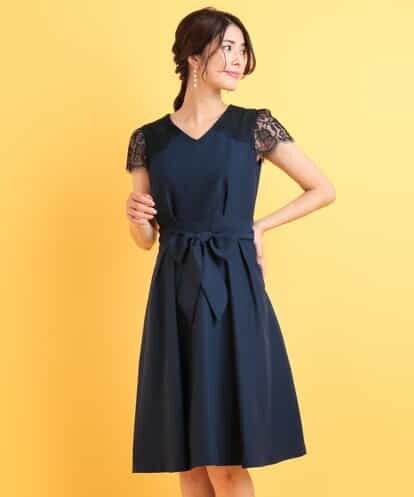 ◆秋の新作アイテム◆肩と袖に繊細なスカラップレースをあしらったワンピースドレスです。レースは落ち着いた色合いの配色にしています。フィット&フレアー型でウエストマークできるサッシュリボン付き。スタイルを良く見せてくれます。