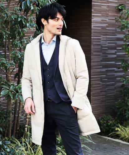 アクティブなスポーツカジュアルテイストを取り入れた ビジネスシーンから週末のプライベートタイムまで 今までにない、スポーティカジュアルなテイストを取り入れたダウンコート モダンなベルベットフーデットデザイン 軽量なライトダウン構造で、ふっくらとした軽い仕上がりのダウンコート 日本の北陸産地で織られた新素材 本来の綿ベースのミリタリーテイストなリップストップをポリエステル糸でモダンに織り上げた素材を使用 二重織りのような手持ち感でありながら、膨らみがあり軽量に仕上げています。 シワになり難く、イージーケアーでお手入れがしやすいコート。 フードの内側に付く、インサイドスタンドカラー衿元の寒気を防ぎます。 スポーティなフードデザインをモダンテイストに帰るウエストベルト付き (ベルトの脱落を防止するミニベルト付き) ベンツ仕様はインバーテッドプリーツで、裾からの寒気の侵入を防ぎます。
