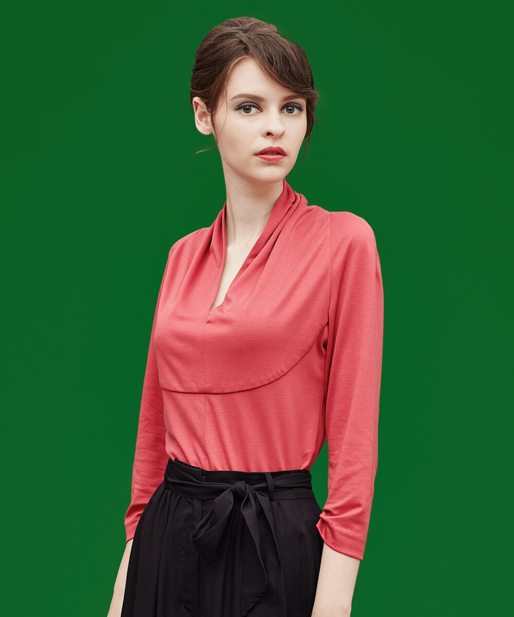 ソフトな風合いに滑らかな肌触りが魅力のテンセル100%を使用したデザインカラートップ。ネック部分を立体的にデザインすることで顔周りを華やかに演出。ラウンドに切り替えたフロント部分がアクセントになり、女性らしいシルエットを作ります。着るだけでハイセンスな着こなしが叶う一着です。※日本製model:H170 B80 W58 H81 着用サイズ:M