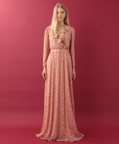 <数量限定アイテム>存在感抜群のインパクトのあるレースで仕立てたロングドレス。柔らかな表情のフェミニンなレース素材を、袖には裏地を付けず透け感を活かして仕上げました。シルク素材で切り替えたウエストや、カシュクール風に重ねたフロントを華やかに演出するフリルがエレガントさをより強調した一着です。※裏地付き、サイドファスナーmodel:H170 B81 W59 H88 着用サイズ:M