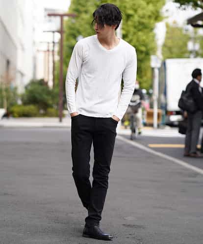 柔らかなコットンミックスの肌触りの良いテキスタイルで仕立てたカットソーです。ラフに着こなせるVネックのロングTに、ヘリンボン柄の立体感のある編地がポイントになった一着です。デニムからモードなボトムスまで幅広く合わせられるデザイン性の高いカットソーアイテムです。model:H185 C86 W71 H91 着用サイズ:L