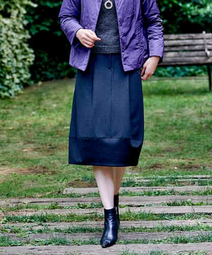 レーヨン混の、ウールのような風合いのテキスタイルで仕立てたスカートです。モードな雰囲気を演出してくれるピンストライプを、様々な方向に切り替えた特徴的な設計がポイントになった一着です。タックを入れた立体的なコクーンシルエットは、裾をカーブに切り替えフェミニンムードをプラス。すっきりと魅せるウエストは、トップスをインしてもきれいにまとまります。※裏地付き、フロントファスナーmodel:H165 B76 W61 H84 着用サイズ:M