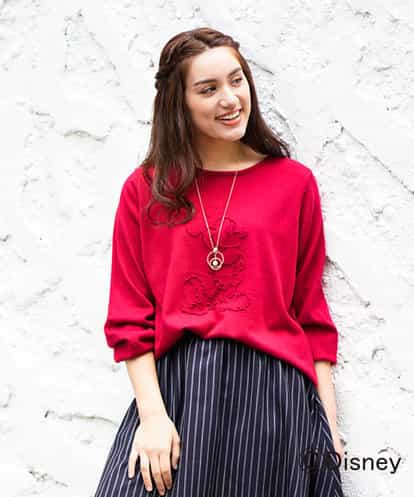 これからの季節に欠かせないニットをゆったりとした女性らしいニュアンスで仕上げました。広いネックの開きとほんのりボリュームを持たせたスリーブデザインがポイント。ミッキーマウスのサガラ刺繍がキュートなアクセントになっています。