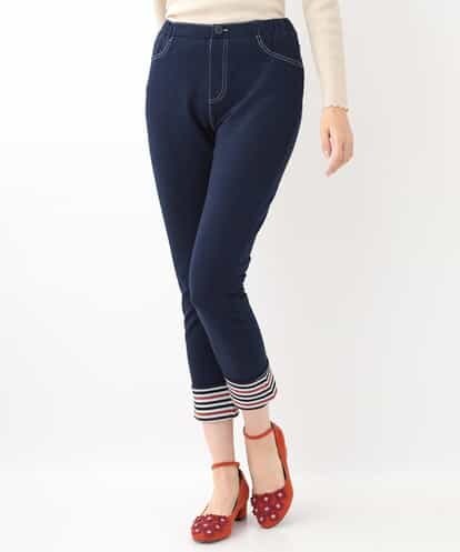 ニットデニム 裏ボーダーヘムデザインパンツ ネイビー 42